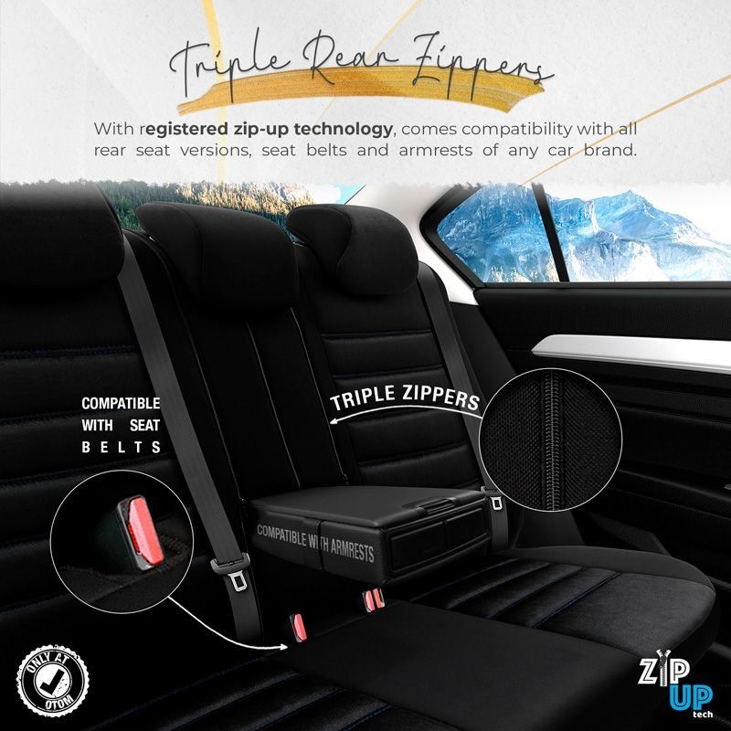 *De achterbankhoes is voorzien van ritsen, deze maken het in delen neerklappen van de achterbank mogelijk, maar biedt ook de mogelijkheid de (mits aanwezige) middenarmsteun te gebruiken