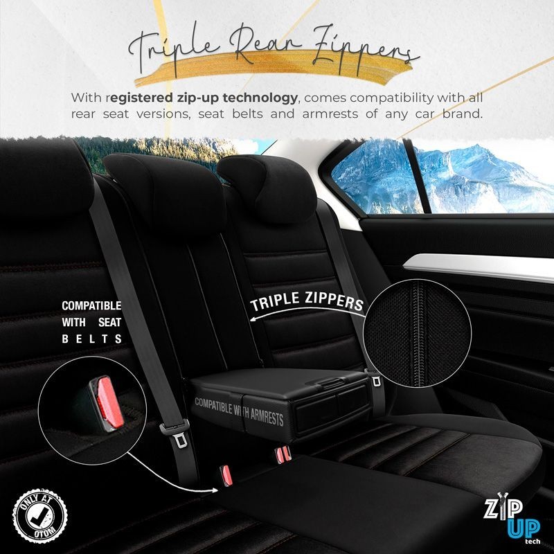 *De achterbankhoes is voorzien van ritsen, deze maken het in delen neerklappen van de achterbank mogelijk, maar biedt ook de mogelijkheid de (mits aanwezige) middenarmsteun te gebruiken